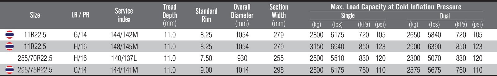 - Shallow tread depth promotes low rolling resistance for fuel economy and long even wear