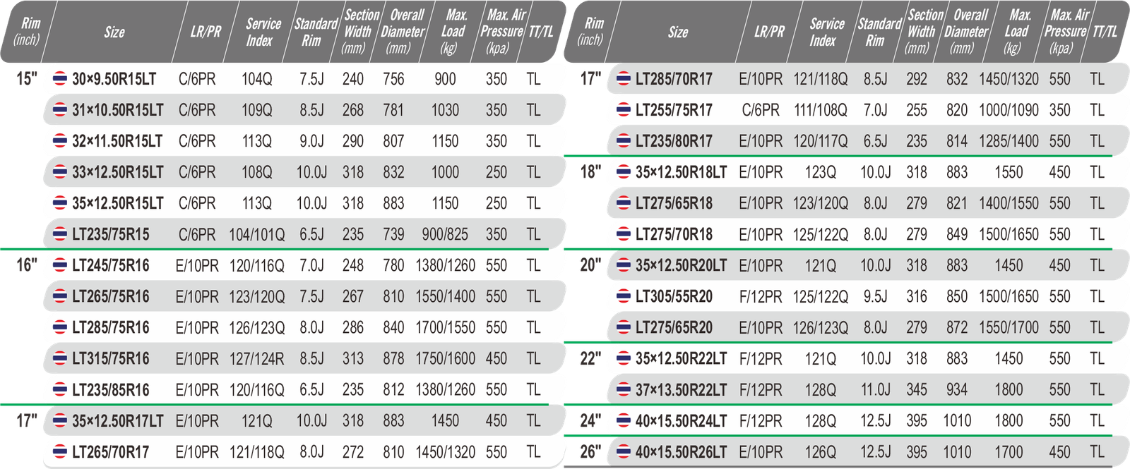 235, 245, 255, 265, 275, 285, 30, 305, 31, 315, 32, 33, 35, 37, 40