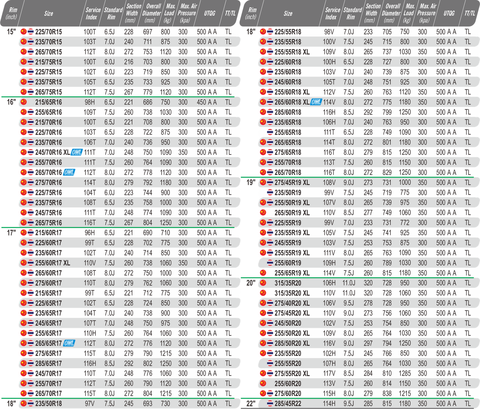 215, 225, 235, 245, 255, 265, 275, 285, 315