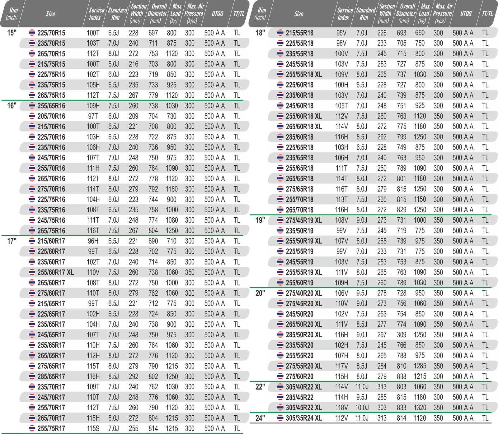 205, 215, 225, 235, 245, 255, 265, 275, 285, 305